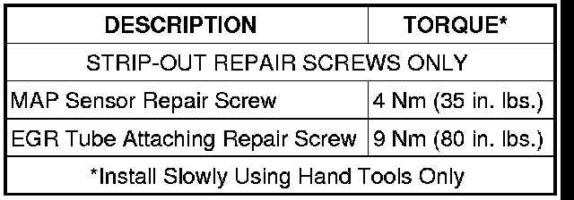 The composite upper intake manifold thread bosses, if stripped out, can be repaired by utilizing a repair screw available through Mopar(R) parts. Repair screws are available for the following manifold attached components: