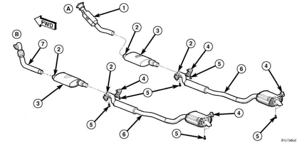 The exhaust system consists of a catalytic converter, muffler, and a resonator with connecting pipes in-between. The system is serviced in three sections; the catalytic converter, the muffler, and the resonator and tailpipe. A band clamp is used to connect the joint between the muffler and catalytic converter. A band clamp is used to connect the muffler and the resonator and tailpipe. Support hanger rods with rubber isolators are used to support and isolate the exhaust system. A flexible joint, integral to the catalytic converter, allows for engine movement. A second flexible joint is located between the muffler and the resonator/tailpipe assemble to allow for exhaust system movement. The exhaust system is tuned for each vehicle/powertrain combination.
