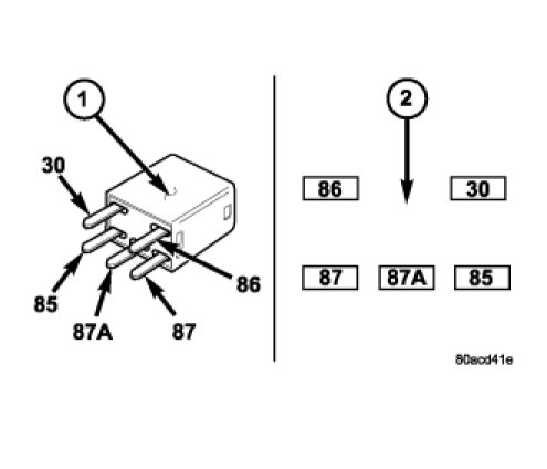 The A/C clutch relay (1) is an International Standards Organization (ISO) micro-relay. Relays conforming to the ISO specifications have common physical dimensions, current capacities, terminal functions and patterns (2). The ISO micro-relay terminal functions are the same as a conventional ISO relay. However, the ISO micro-relay terminal pattern (or footprint) is different, the current capacity is lower and the physical dimensions are smaller than those of the conventional ISO relay.