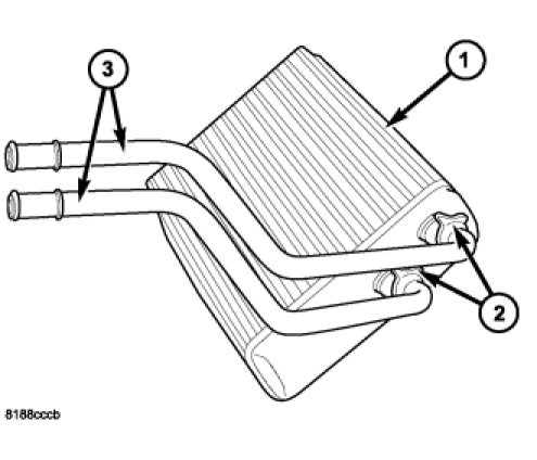The heater core (1) is mounted into the HVAC air distribution housing, located behind the instrument panel. The heater core is a heat exchanger made of rows of tubes and fins. The heater core is secured to the air distribution housing by a plastic retaining bracket and two screws. The heater core tubes (3) are attached to the heater core by use of metal retaining clamps (2) and rubber O-ring seals.
