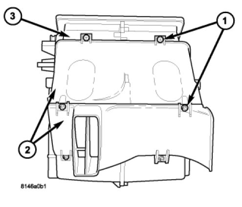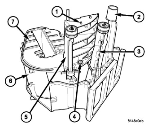 3. Align the pivot shafts of the air doors (2, 3 and 5) with the pivot holes in the center partition (7) and install the partition onto the passenger side of the air distribution housing (6).