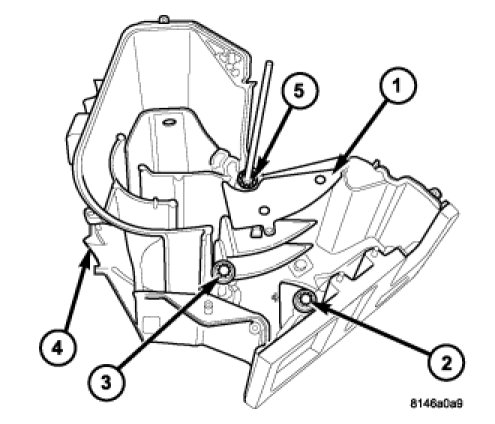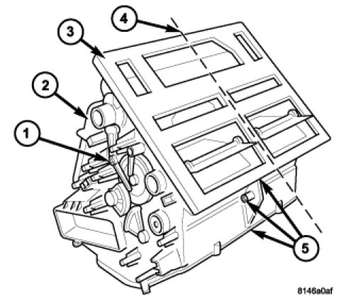 1. Install the air doors (2, 3 and 5) into the passenger side of the air distribution housing (4). Align the air doors with the pivot shaft holes in the housing.
