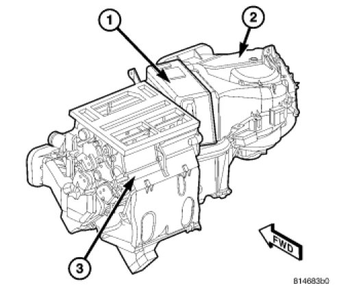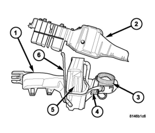 1. Install the A/C evaporator (5) into the lower HVAC housing (1). Make sure that the evaporator drain within the HVAC housing is clean and unrestricted and that the insulator around the A/C evaporator is properly installed.