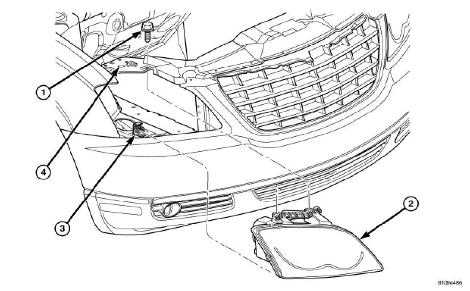 3. Gently pull front lamp unit (2) forward, unsnapping it from the lower retaining clip (3). Be careful not to damage lower retaining clip upon removal.