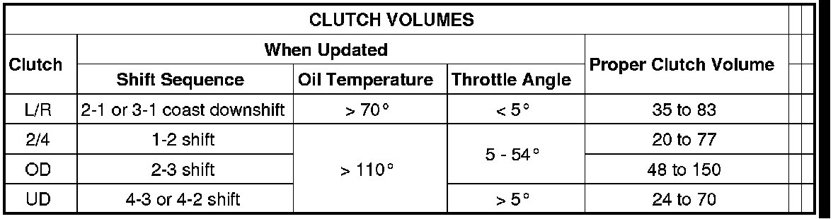 Certain mechanical problems within the clutch assemblies (broken return springs, out of position snap rings, excessive clutch pack clearance, improper assembly, etc.) can cause inadequate or out-of-range clutch volumes. Also, defective Input/Output Speed Sensors and wiring can cause these conditions. The following chart identifies the appropriate clutch volumes and when they are monitored/updated: