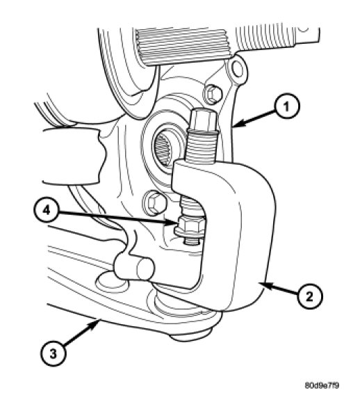 18. Place Press (2), Special Tool C-4150A, over ball joint stud and nut (4) as shown. Release ball joint stud from steering knuckle (1) by tightening tool screw-drive. To ease Remover installation and use, it may help to rotate knuckle around so inside of knuckle faces outward.