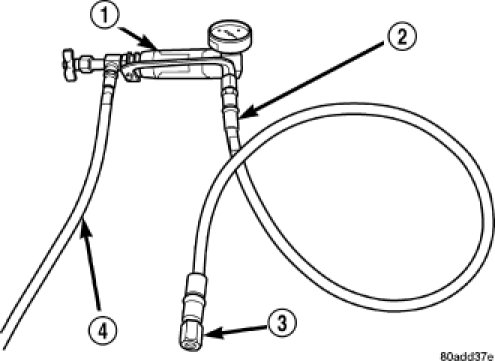 1. Assemble hoses on Power Steering Analyzer as shown. Install Pressure Hose (2), Special Tool 6959, in inlet fitting (gauge end) of Power Steering Analyzer flow meter (1). Install Pressure Hose (4), Special Tool 6905 (in 6893 kit), into outlet fitting (valve end) of Power Steering Analyzer flow meter (1). Install Pressure Hose, Special Tool 6713 (in 6815 kit) on 6905 (4).