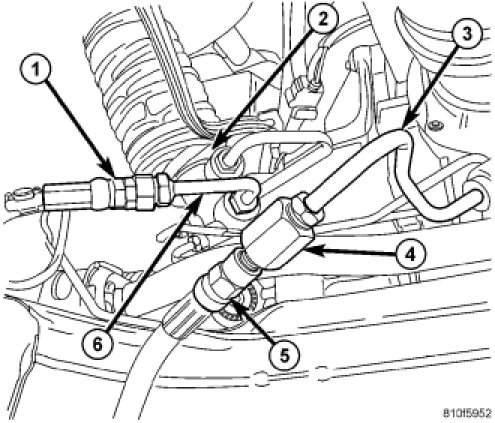 7. Thread Adapter (6), Special Tool 8185-1A, connected to Analyzer hose, into open power steering gear lower port. Tighten tube nut to 31 Nm (23 ft. lbs.). Route hoses away from exhaust system as well as other unfriendly surfaces.