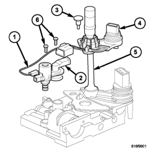 The line pressure sensor (2) is mounted on the top of the valve body, next to the pressure control solenoid (1).