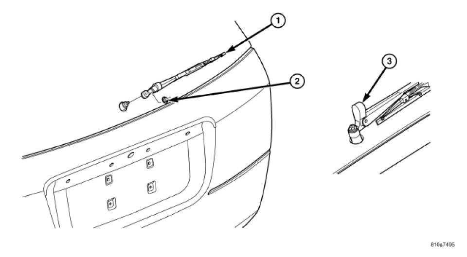 2. Install the rear wiper arm retaining nut (2). Tighten nut to 11.86 Nm (105 in. lbs.).