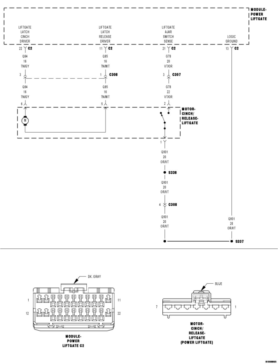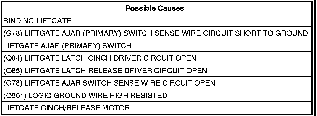 Measure the resistance of the (G78) Liftgate Ajar Switch Sense wire to the (Q901) Logic Ground circuit in the Liftgate Cinch/Release Motor connector.