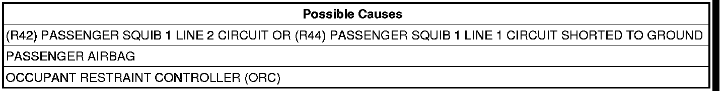 3. CHECK (R42) PASSENGER SQUIB 1 LINE 2 CIRCUIT AND (R44) PASSENGER SQUIB 1 LINE 1 CIRCUIT FOR A SHORT TO GROUND