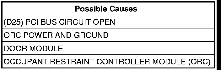If the door module does not receive any messages from the Occupant Restraint Controller Module (ORC) within 5 seconds, this code will set.