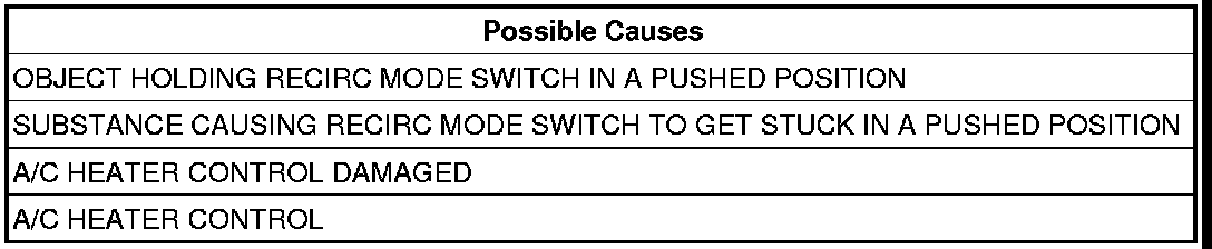 2. INSPECT FOR OBJECT OR SUBSTANCE CAUSING THE RECIRC MODE SWITCH TO STAY OR STICK IN A PUSHED POSITION