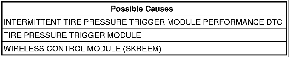 The WCM (SKREEM) will monitor the messages from each Tire Pressure Trigger Module over the LIN bus. If any of the messages are not received, or are received other than as expected, a DTC will set. When the condition is corrected, or is no longer detected, as acknowledged via a LIN bus message, the WCM will reset the appropriate trigger module fault status.