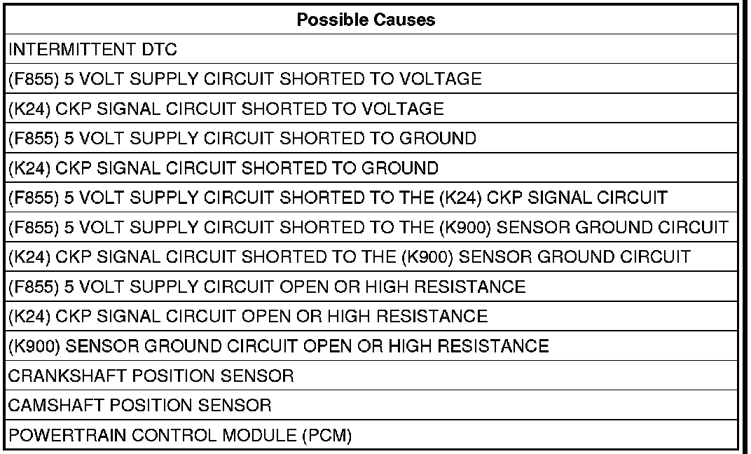 - Repair the (F855) 5 Volt Supply circuit for a short to the (K24) CKP Signal circuit.