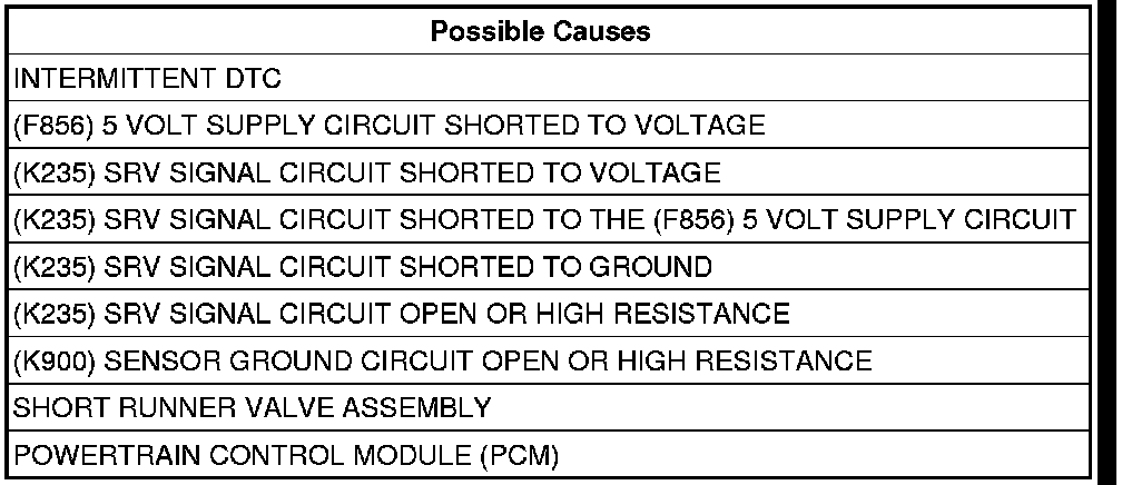 Measure the resistance between the (K235) SRV Signal circuit and the (F856) 5 Volt Supply in the Short Runner Valve Assembly harness connector.