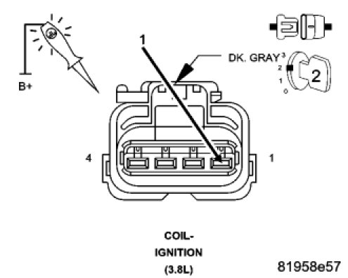 Using a 12 volt test light connected to ground, check the (K344) ASD Relay Output circuit in the Ignition Coil harness connector.