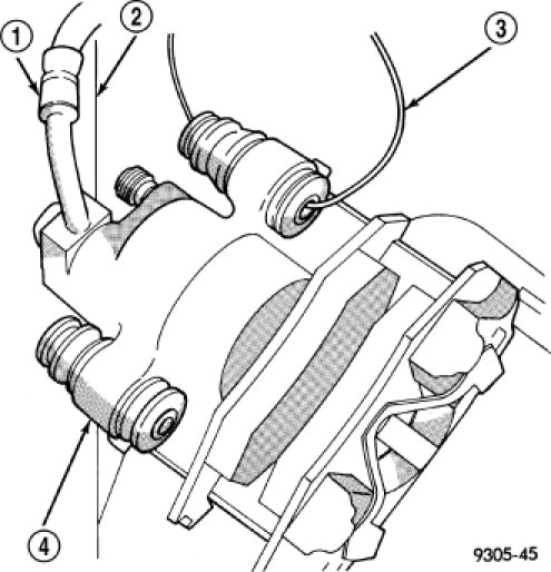 14. To prevent weight of caliper from overextending and damaging brake hose (1) and tubing while caliper is off mount, hang brake caliper from vehicle using wire or cord (3). Be sure to hang caliper and brake hose far enough forward on body, away from crossmember, to allow sufficient room to lower crossmember without interference.
