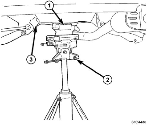19. Position under-hoist utility jack (2) or transmission jack under center of rear suspension crossmember (3) (without AWD) or rear driveline module (with AWD). Raise jack head to contact driveline module/suspension crossmember and secure in place.