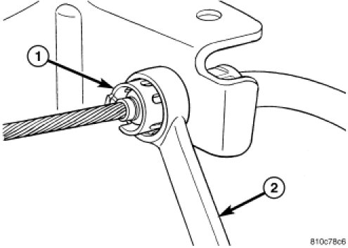 31. Place a 13 mm 12-point box wrench (2) over cable retainer on end of cable housing at crossmember and collapse retainer (1) fingers. Remove cable from crossmember.