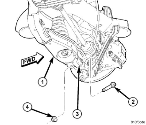 33. While holding toe adjustment cam bolt (2) from rotating, remove nut securing toe link at crossmember (1). Remove link from cam bolt, then remove cam bolt and washer from crossmember.