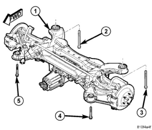21. Remove both front (5) and rear (2) crossmember mounting bolts on right side of vehicle.
