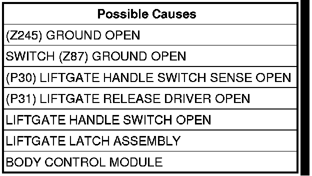 - Repair the (P30) Liftgate Handle Switch Sense circuit for an open.