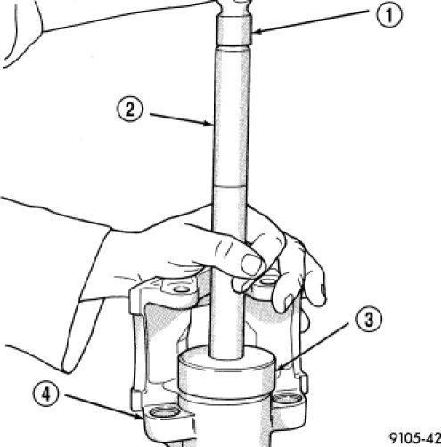 5. Seat dust boot in caliper counterbore using Installer (3), Special Tool 9089, with Handle (2), Special Tool C-4171. Install dust boot until it bottoms. Do not over-seat dust boot or damage will occur.