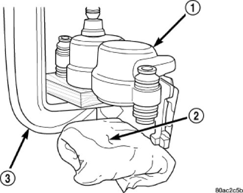 3. C-clamp (2) a block of wood (1) over one piston.
