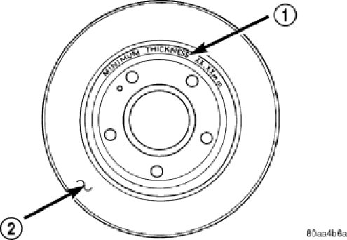 NOTE: All brake rotors (2) have markings for minimum allowable thickness cast on an unmachined surface of the rotor (1) or stamped into the hat section. Minimum thickness specifications can also be found in this component's specification table. Specifications