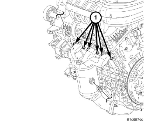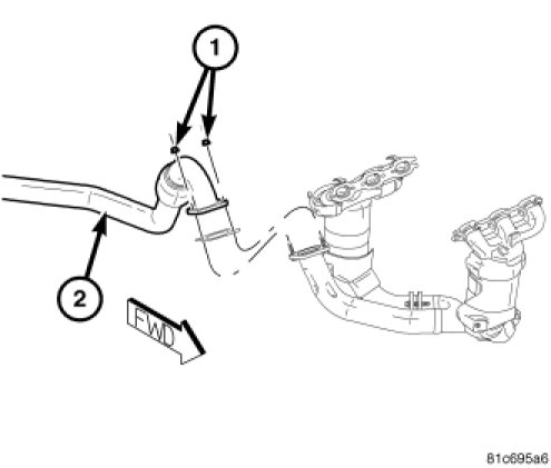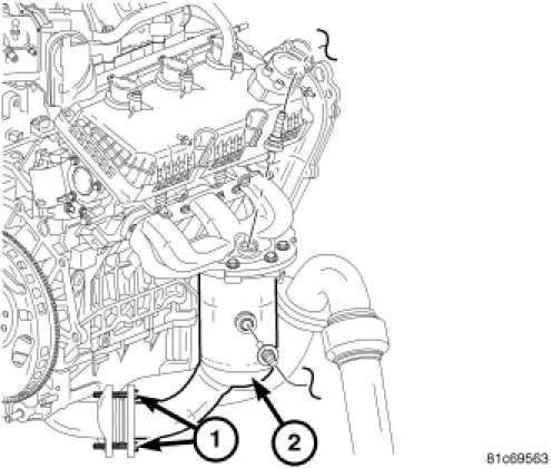 2. Install the exhaust pipe, then loosely install the exhaust-to-crossunder fasteners (1).
