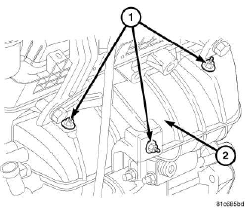 6. Install the front maniverter heat shield (2), and install the front maniverter heat shield fasteners (1).