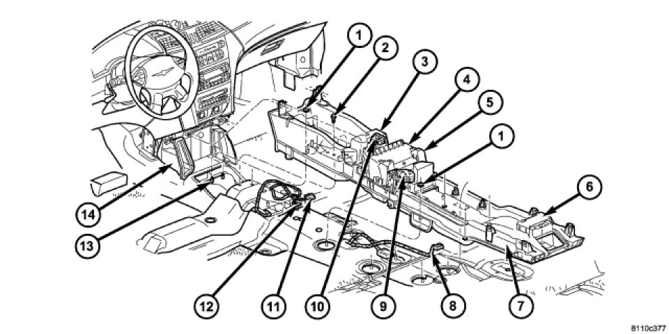 1. Position the floor console base and duct assembly (7) into the vehicle and connect it to the floor distribution duct (14).
