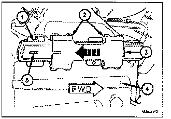 2. Slide the air filter door latch (2) from the closed stop (3) toward the rear of the vehicle until it contacts the open stop (5).