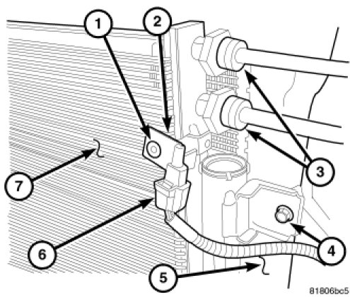 8. Install the bolt (4) that secures the left side of the A/C condenser (7) to the radiator (5). Tighten the bolt to 5 Nm (45 in. lbs.).