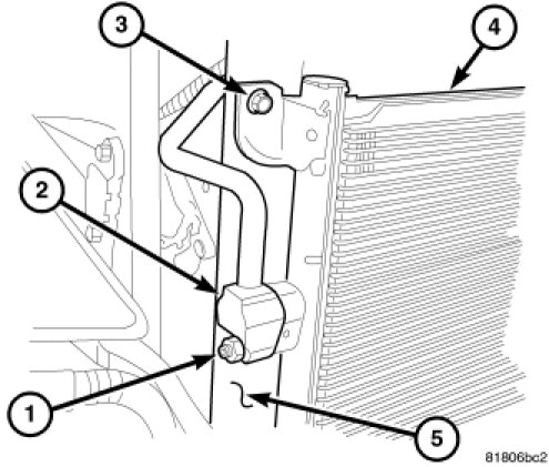 5. Install the bolt (3) that secures the right side of the A/C condenser (4) to the radiator (5). Tighten the bolt to 5 Nm (45 in. lbs.).