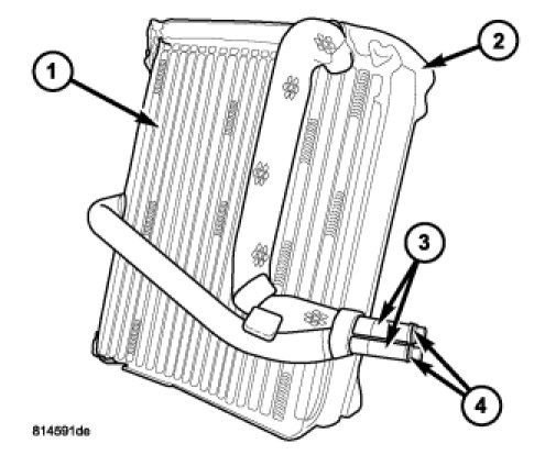 The A/C evaporator (1) is located within the HVAC housing, behind the instrument panel. The A/C evaporator and insulator (2) are positioned in the HVAC housing so that all air entering the housing must pass over the evaporator fins before it is distributed through the heating-A/C system ducts and outlets. However, air passing over the evaporator fins will only be conditioned when the A/C compressor is engaged and circulating refrigerant through the A/C evaporator.