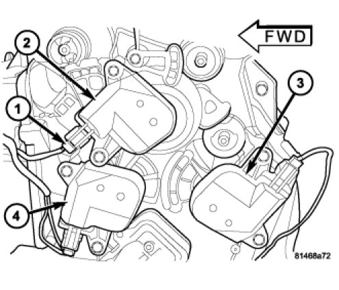 5. Connect the HVAC wire harness connectors (1) to the mode door actuator (2) and the two blend door actuators (3 and 4) located on the driver side of the air distribution housing.