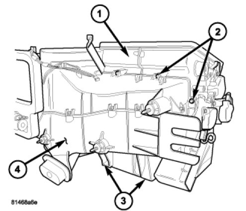 1. Install the air distribution housing (1) onto the rear of the HVAC housing (4) by inserting the two tabs (3) on the bottom of the distribution housing into the slots located on the bottom of the HVAC housing and tipping the distribution housing forward until it is properly aligned with the HVAC housing.