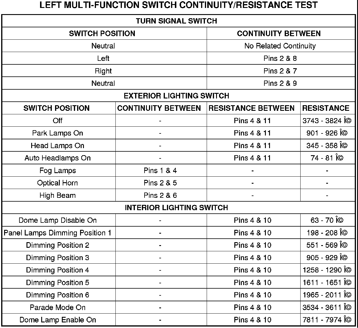 2. Using an ohmmeter, perform the continuity and resistance tests at the terminals in the left multi-function switch connector (refer to Diagrams/Electrical for connector views) as shown in the LEFT MULTI-FUNCTION SWITCH CONTINUITY/RESISTANCE TEST table.