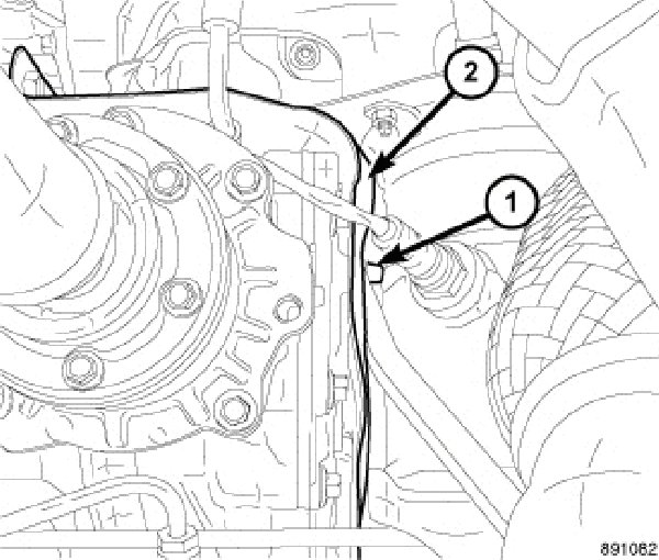 6. An allen wrench (1) with approximately 1-1/8" clearance in the location shown (2), will be required to remove the PTU fill plug.