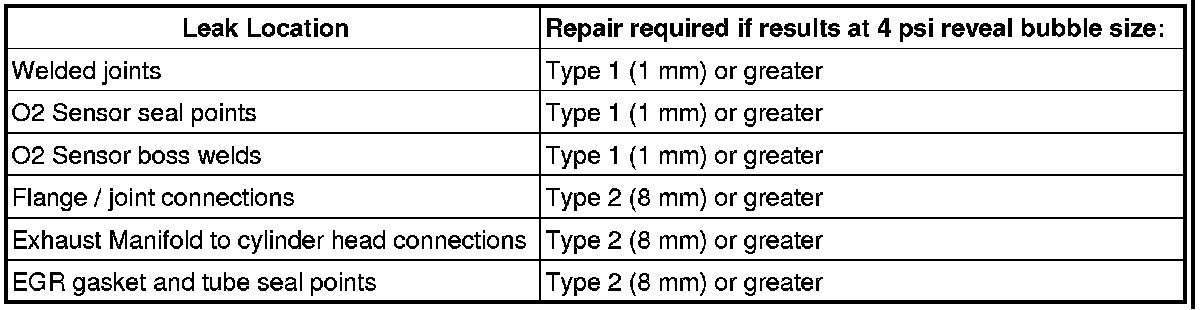 Any Type 1 or greater leaks found in welded joints, O2 sensor seal points or O2 sensor boss welds must be repaired or the component must be replaced.