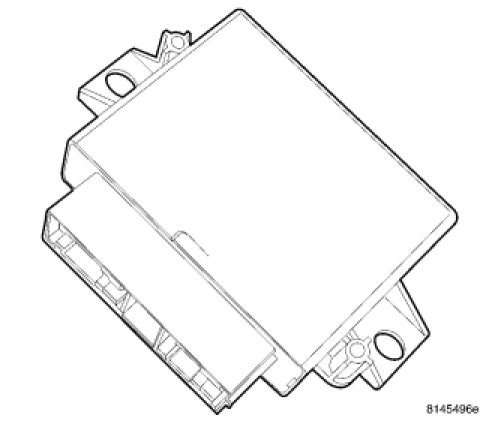 The Park Assist Module is located on the left side of the vehicle, behind the quarter trim panel, just in front of the D-pillar. It has a molded plastic housing with internal circuitry and one electrical connector. There are two mounting tabs that affix the module to the left inner quarter panel with two screws.