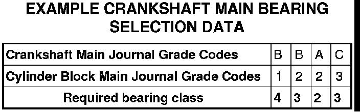 This example shows how to determine the bearing class needed for each crankshaft main journal, assuming that a new crankshaft is being installed in a new or existing engine block. If the code 'B' 'B' 'A' 'C' is stamped on the #9 counterweight of the crankshaft (3), and the code '1' '2' '2' '3' is stamped on the side of the engine block (1), then main #1 would require Class 4 bearings, main #2 would require Class 3 bearings, main #3 would require Class 2 bearings, and main #4 would require Class 3 bearings.