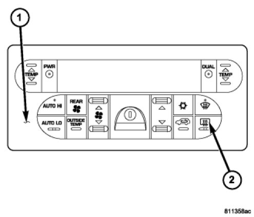 The push-button switch for the rear window defogger (EBL) system (2) is integrated into the A/C-heater control (1) located in the center of the instrument panel. When the rear window defogger switch is activated, the A/C-heater control requests the integrated power module (IPM) to operate the rear window defogger (EBL) relay.