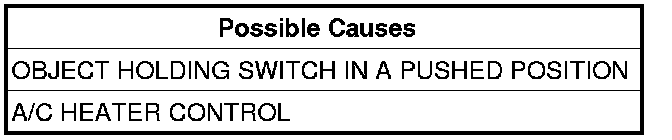 Inspect the A/C Heater Control for an object holding the switch in a pushed position. If present, remove the object.