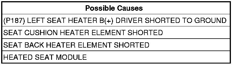 Measure between the (P187) Left Seat Heater B(+) Driver circuit at the Left Seat Heater connector (component side) and the seat frame for a short to ground.