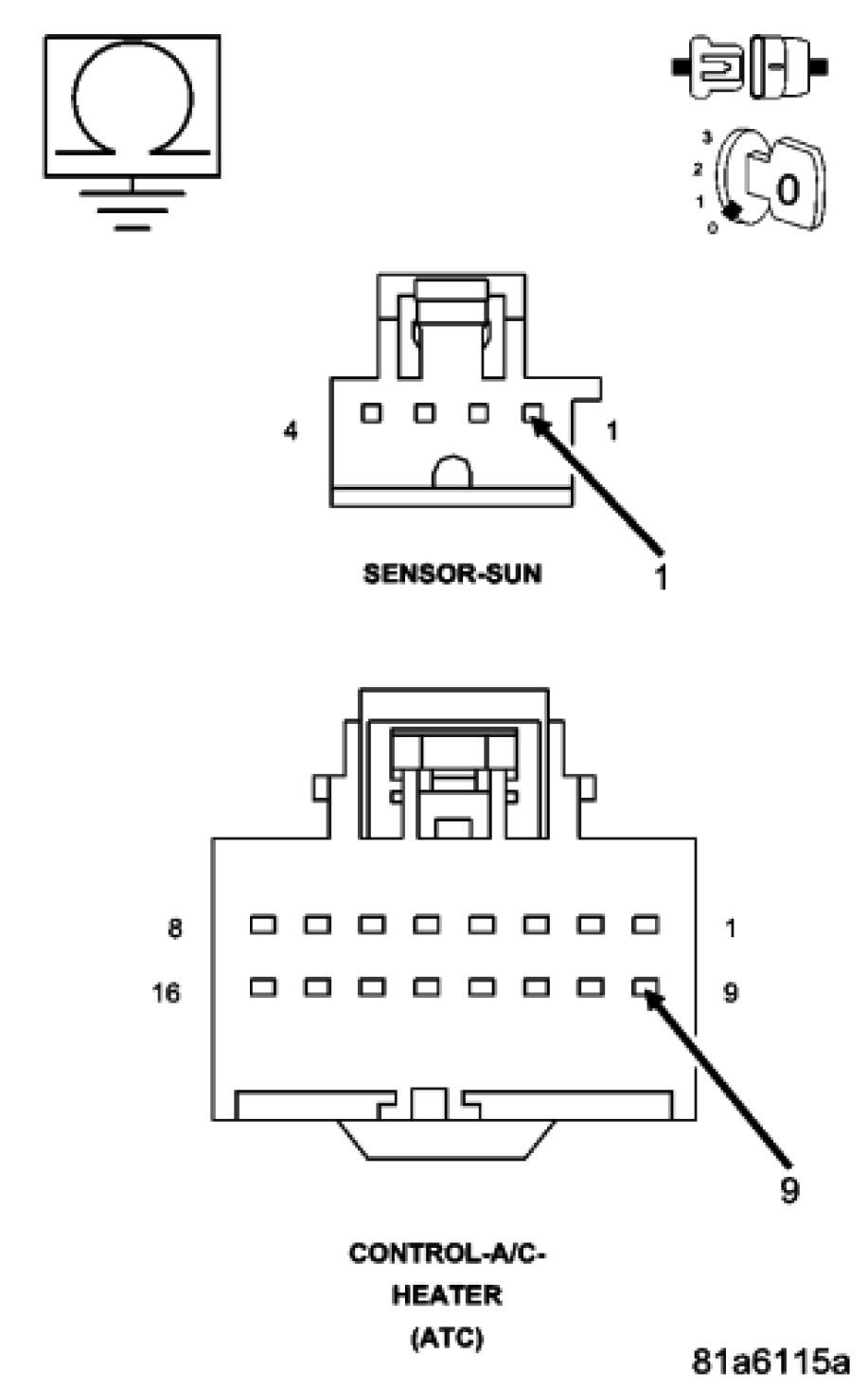 Measure the resistance of the (G939) Sensor Return circuit between the Sunload Sensor harness connector and the A/C Heater Control C1 harness connector.