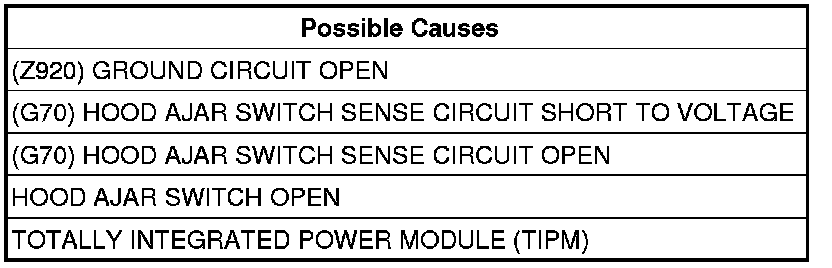 - Repair the (G70) Hood Ajar Switch Sense circuit for an open.